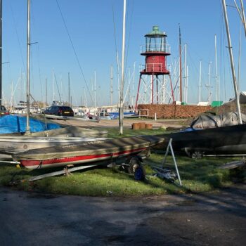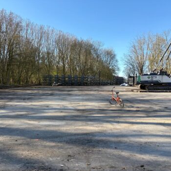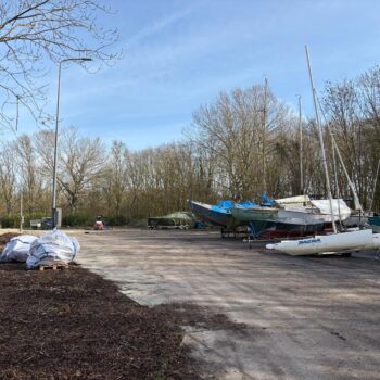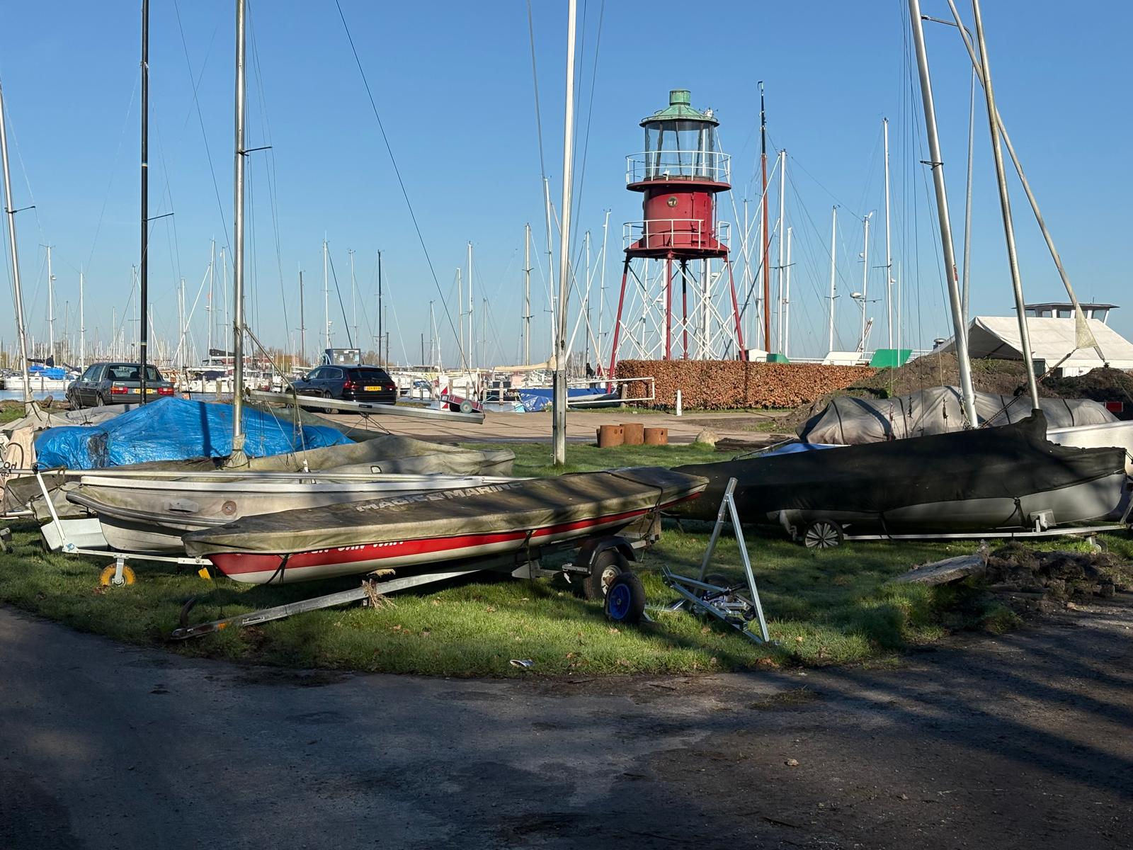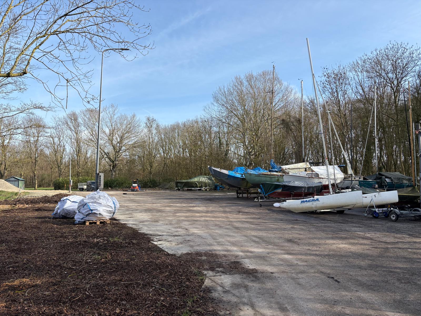 Veld 4 op Hemmeland maakten we leeg – hier komt de nieuwe loods. De jollen verhuizen naar de rotonde, de trailers en laatste boten naar de bosrand. Volgende week wordt de loods uitgezet.